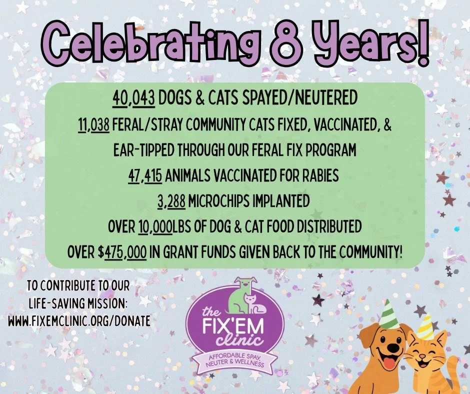 Become a Donor – Make a one-time gift or become a monthly supporter. Even $5/month makes a difference. Donate in person, by mail, through this post, or at: www.FixEmClinic.org/donate