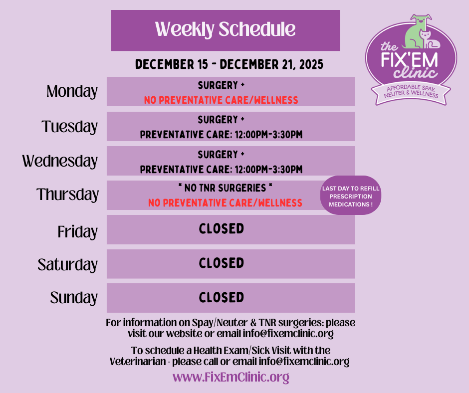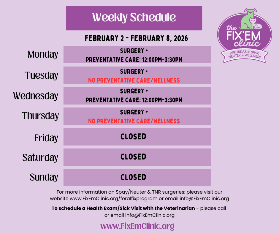 Wellness hours are subject to change due to our surgical schedule. Please always check our Facebook for unexpected updates prior to coming in.